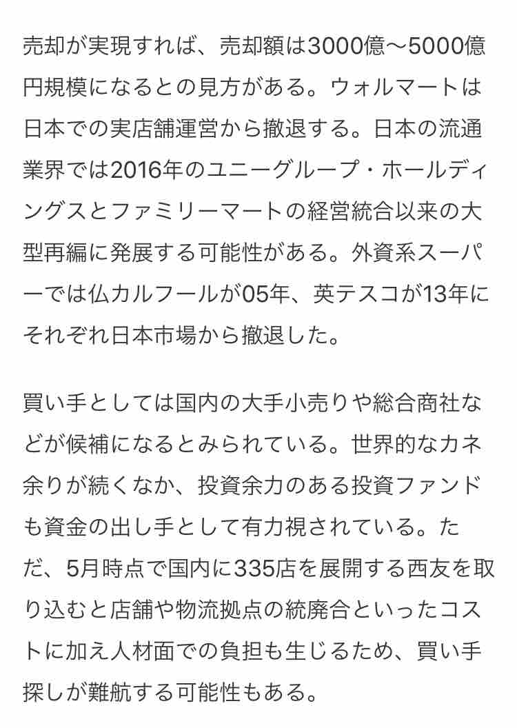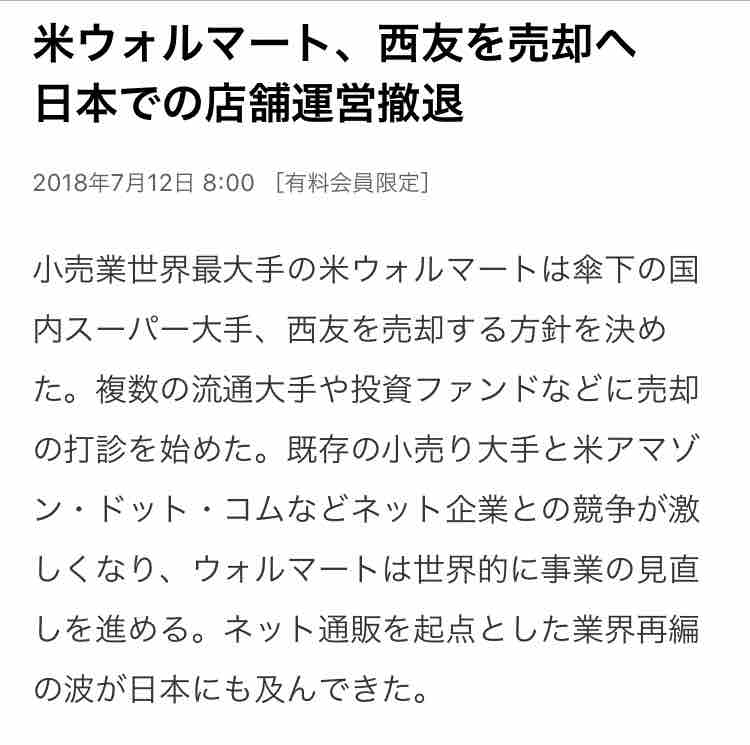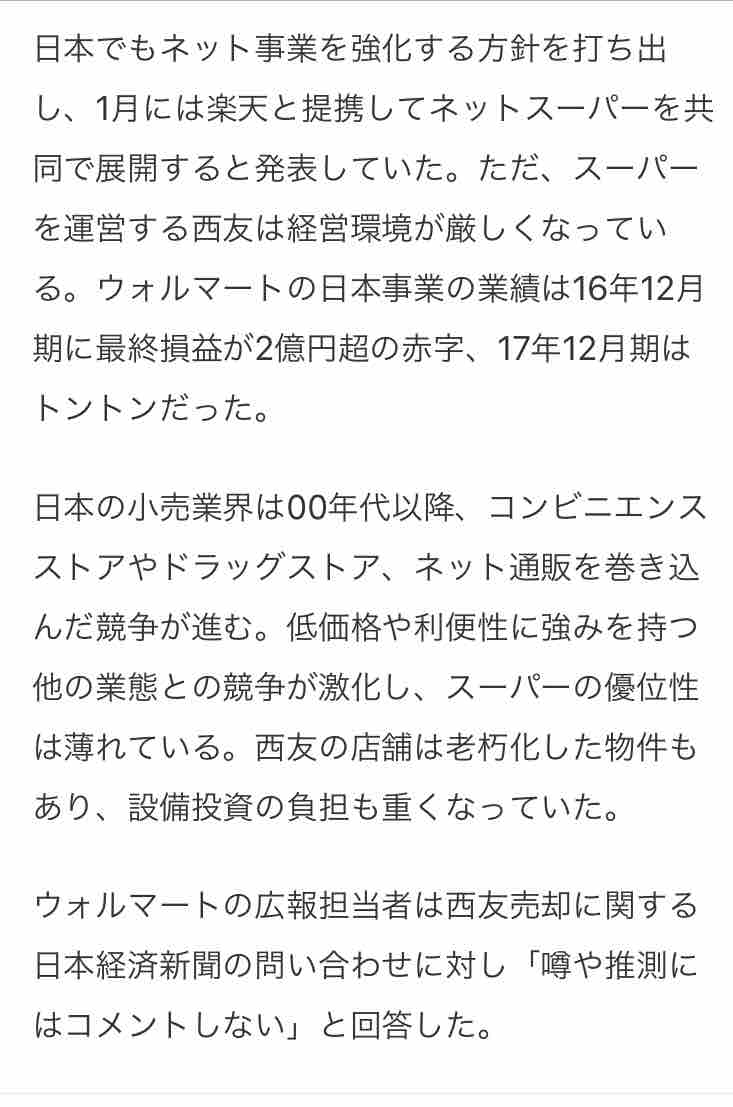 July 12, 2018 ウォルマートが西友売却 カテゴリ:社会、経済、政治 時代の流れだ。小売はなくなる。西友は個人的に思い入れがある。日経より。 コメント コメントフォーム 名前 コメント 記事の評価 リセット リセット 顔 星 情報を記憶 コメントを投稿する