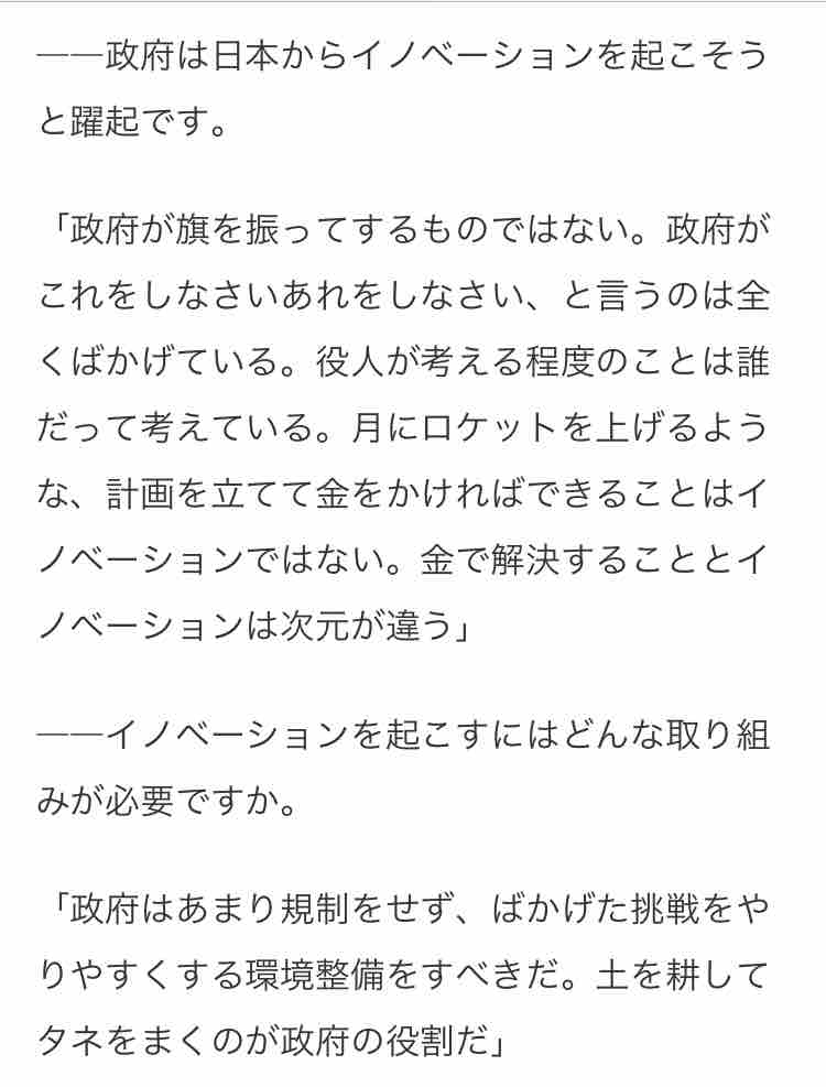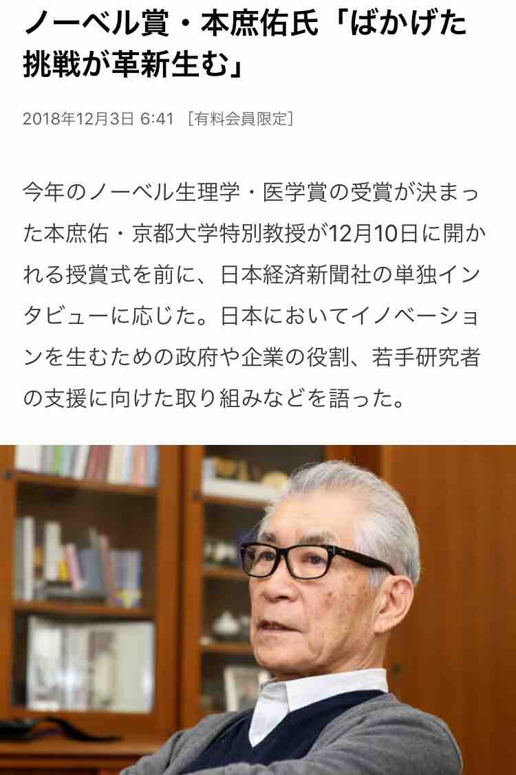 December 04, 2018 「ばかげた挑戦」 本庶佑教授 カテゴリ: 京都大学の本庶佑特別教授のお話。身にしみる。企業も学業もムダがなくなった。もうおしまいだ。にほんブログ村日経よりキーワード1、イノベーションは結果である。 2、イノベーションは政府が旗を振ってやるものではない。3、目的の決まった研究費はイノベーションにつながらない。4、日本の企業は新陳代謝が進まない。以上 これより先はプライベートモードに設定されています。閲覧するには許可ユーザーでログインが必要です。 コメント コメントフォーム 名前 コメント 記事の評価 リセット リセット 顔 星 情報を記憶 コメントを投稿する