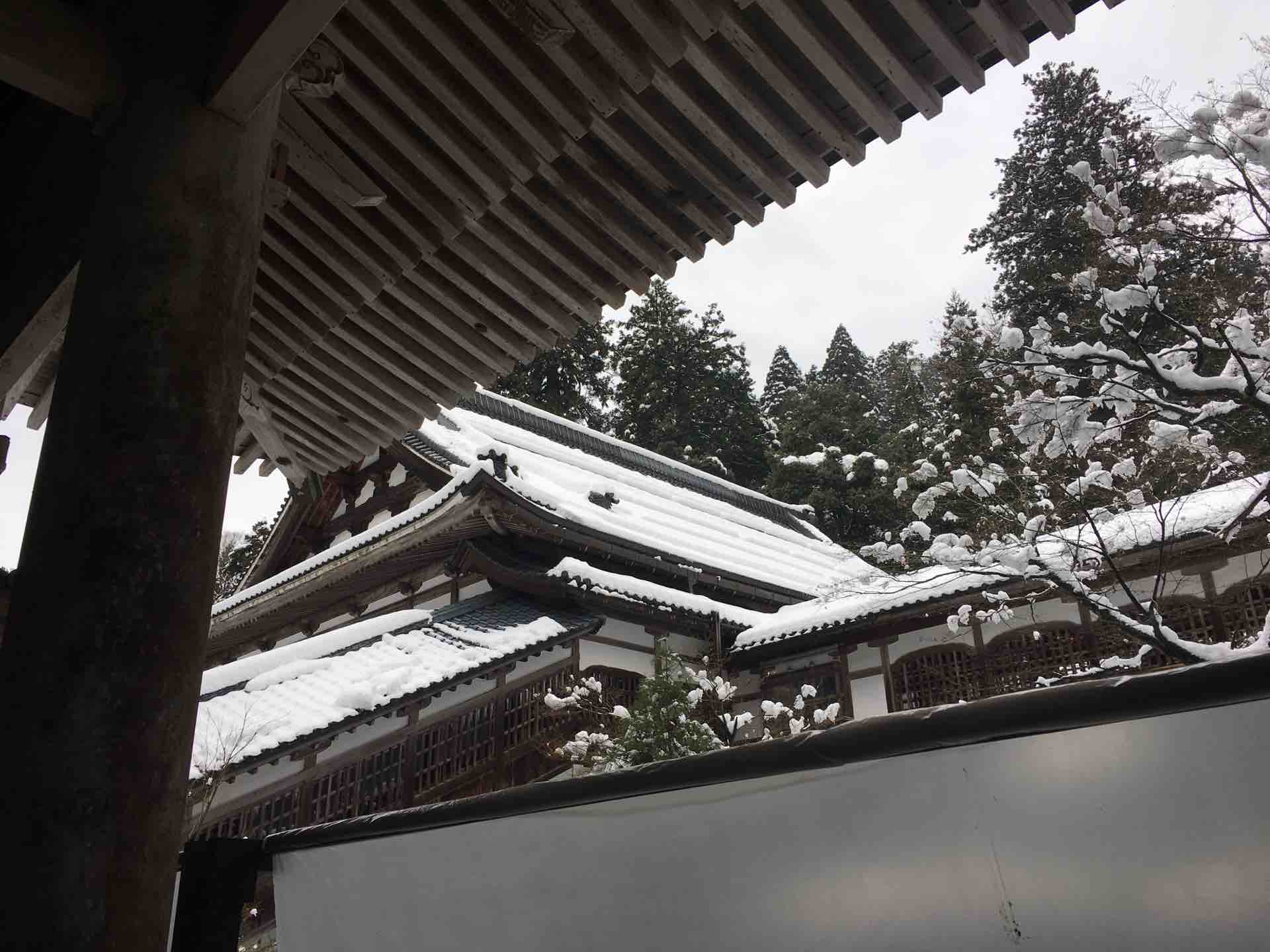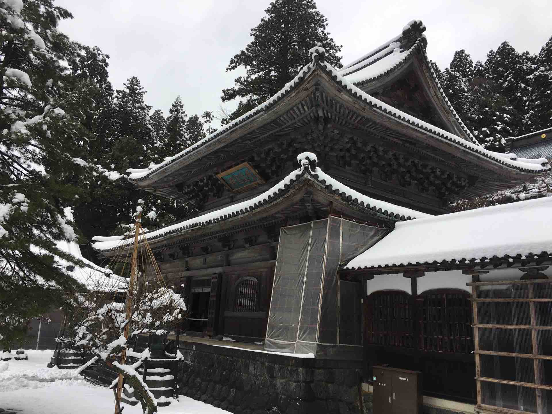 福井駅からバスで永平寺まで1時間はかからない。山道を行くと雪がしんしんと降り注ぎ積もっている。