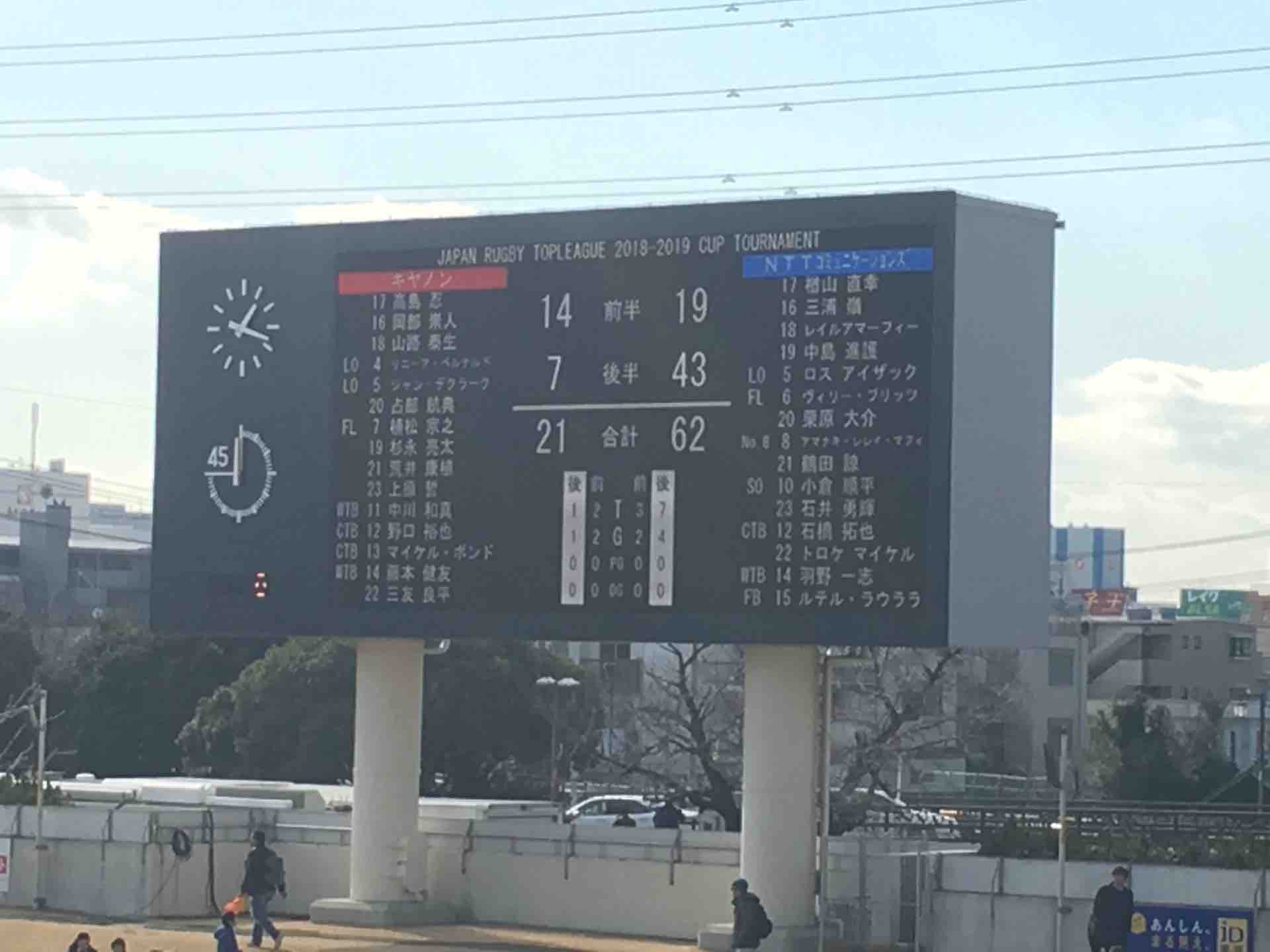 前半はNTTがトリプルスコアの圧勝。キャノンは試合開始直後こそトライを決めてリードしたがスタンドオフのゼイリンガ選手が怪我で退場して流れを失った。