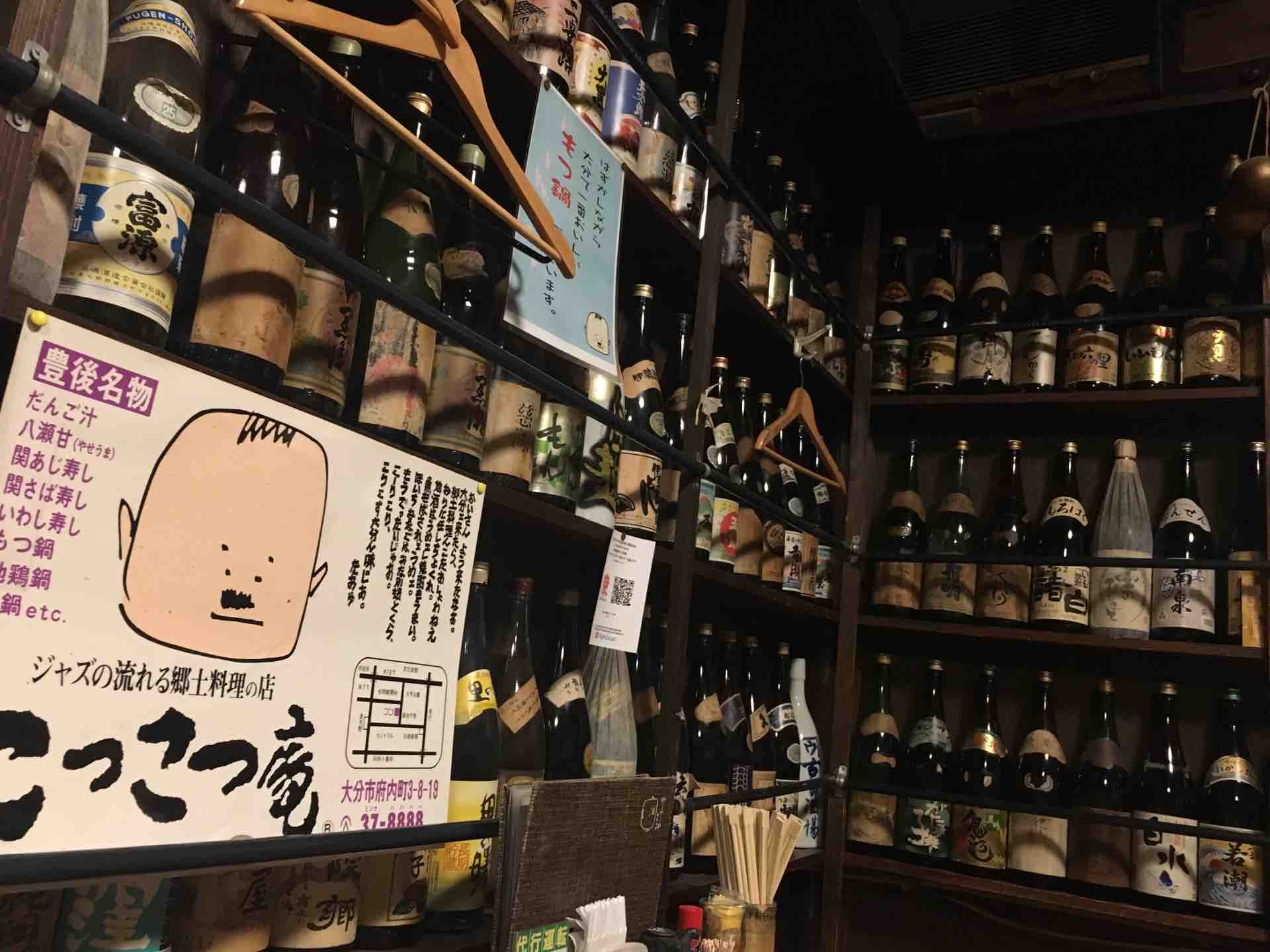 さらに座敷に通されると、日本酒や焼酎の一升瓶がみっしりと敷き詰められていて、部屋の上には大昔のラジオと思しき古めかしい機械がならんでいる。