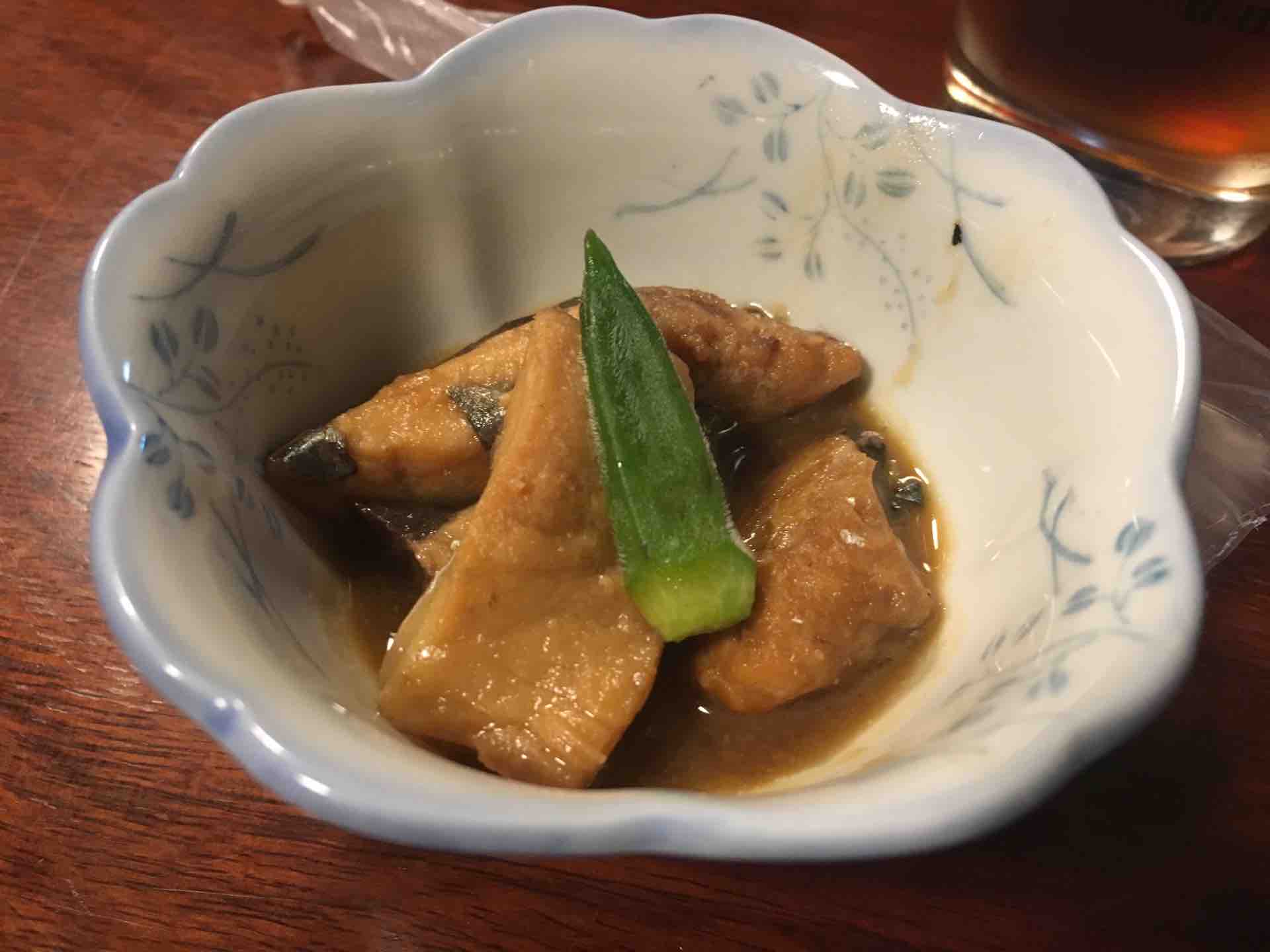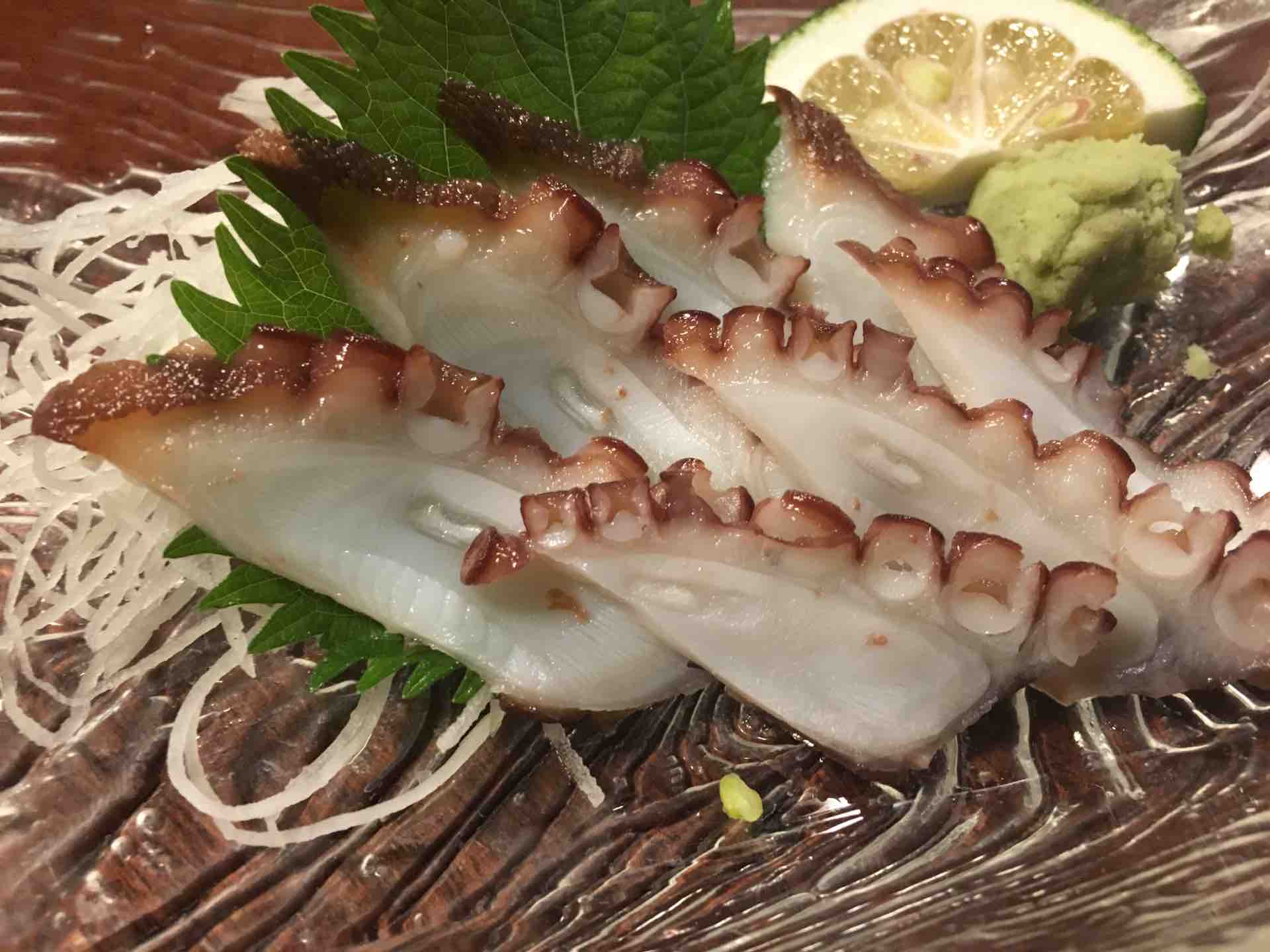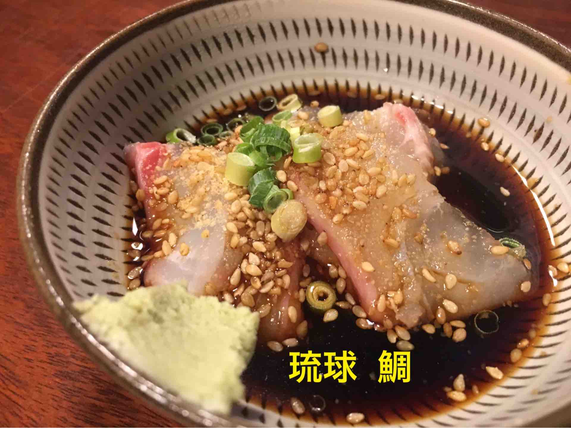 ここには関アジがあったので、タコと琉球というメニューを鯛で注文する。琉球とは甘酢とわさびを混ぜたもののようだ。初めて食べる料理だ。