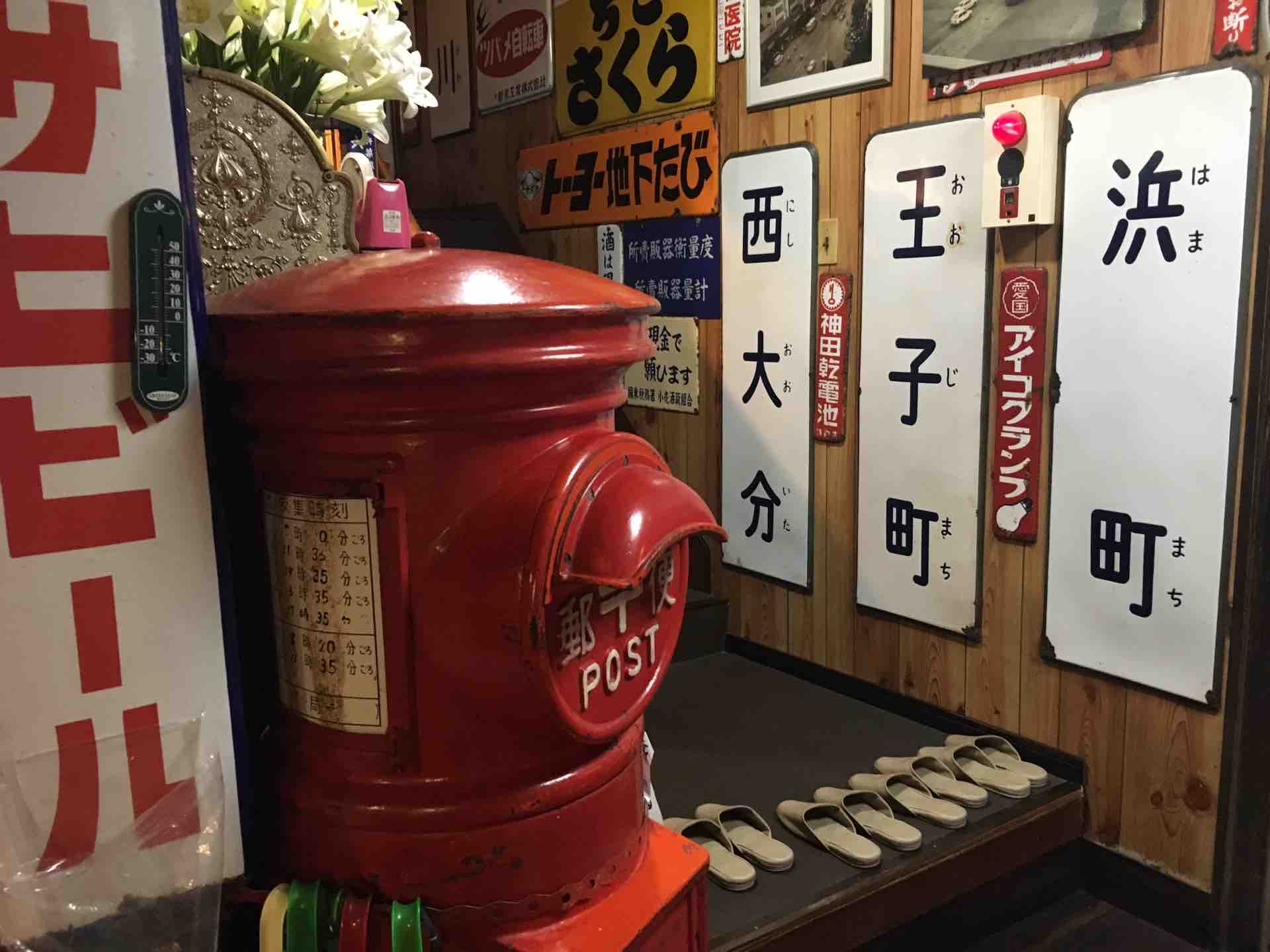 建物の外観から昭和のムードで、店内にはなぜか郵便ポストが鎮座し、店内所狭しと昔見かけたような看板が並ぶ。