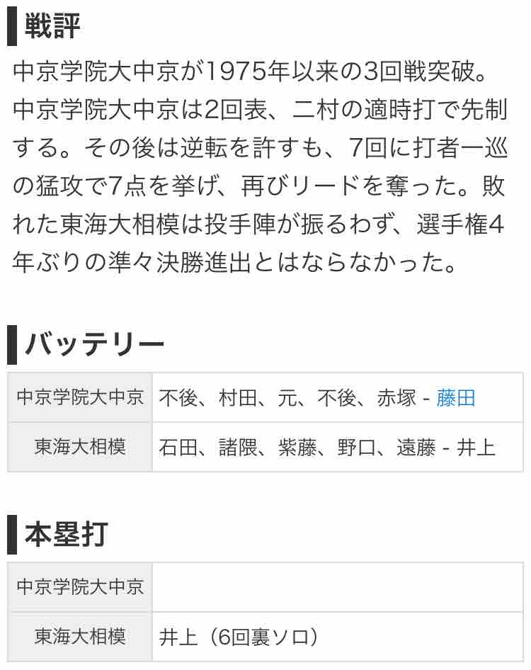 1対1で迎えた6回表、中京大中京はサインミスでチャンスを台無しにする。とかく試合の流れが変わるパターンだが、案の定その裏、東海大相模の3番打者井上捕手にホームランが出て均衡が破れる。しかし、直後7回表に、ヒーローとなるはずの井上捕手の失策などが重なり、中京大中京打線が火を吹いて一挙7点をあげて試合を決めた。