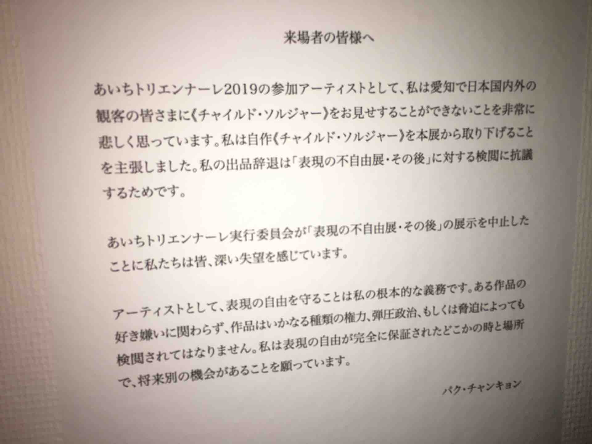 そしてさらに、この問題をきっかけに展示を拒否したアーチストが連名で「表現の不自由」についてメッセージを書かれていた。ここに書かれている作者のキム・ソギョンさんとキム・ウンソンさんのメッセージに我々は対峙しなければならない。キムさんが言われていることが間違いなく正しい。