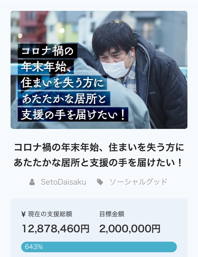 反面、NHKの”マイあさ!”では、バブル期より景気停滞期に寄付の意識が高まるそうで、コロナ禍でクラウドファンディングが広く利用されているということだ。キャンプファイアーというサイトを見ると、たしかに寄付が目標をはるかに上回る。