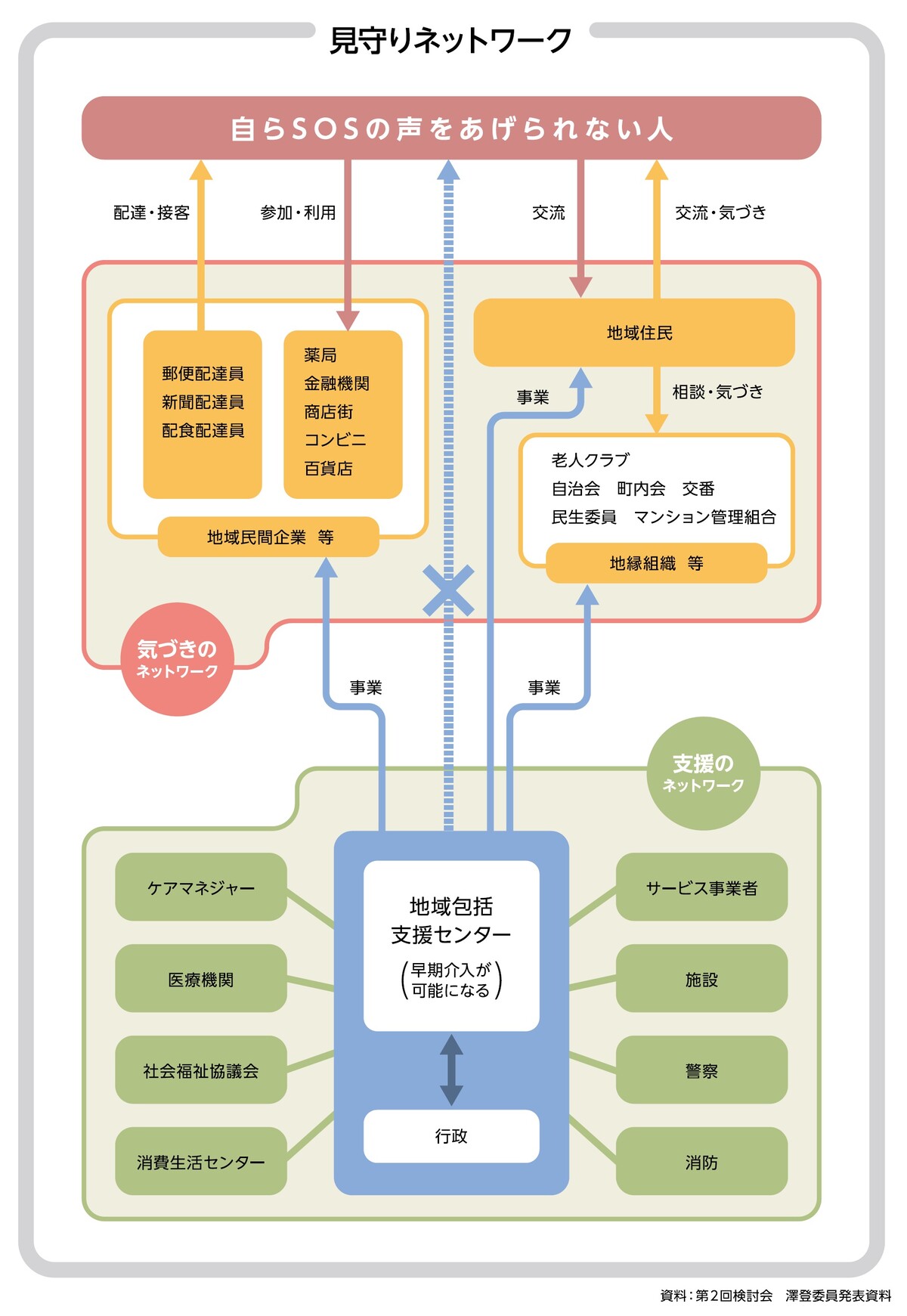 行政側では医療や介護などの「支援部門」は充実させつつあるが、一人暮らしの高齢者がひきこもりや認知になってゆく過程に「気づく」社会が未成熟なため、「支援部門」への橋渡しができない現実を突きつけている。そして「気づき」のためには、高齢者の日常生活に密着した民間の努力が必要だ、という結論に落ち着いている。