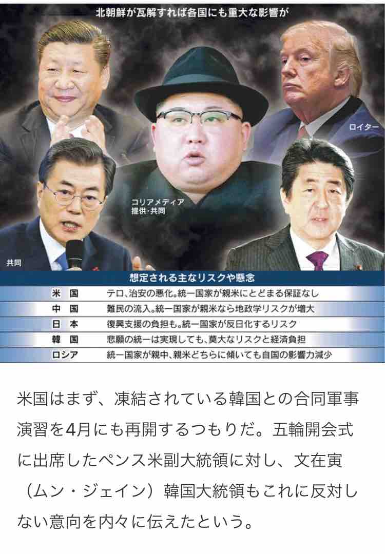 February 23, 2018 不都合な真実 カテゴリ:社会、経済、政治 北朝鮮をめぐる不都合な真実。日経より。個人的には東西ドイツ方式で解決していただきたい。金正雲ファミリーは、かつての愛新覚羅溥儀のように、中国あたりで幸せな隠居生活を送ってほしい。 コメント コメントフォーム 名前 コメント 記事の評価 リセット リセット 顔 星 情報を記憶 コメントを投稿する